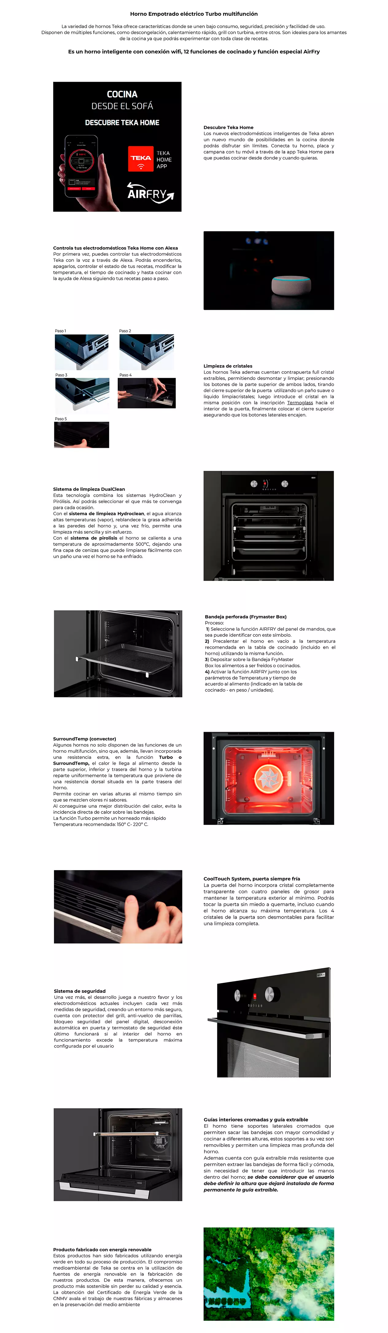 | Más Información | Horno inteligente con conexión WiFi, 12 funciones de cocinado y 20 recetas automáticas, 12 funciones de cocinado, 20 recetas automáticas, Función especial AirFry, para resultados crujientes y saludables con la bandeja perforada FryMaster Box, Función Pirólisis y sistema de limpieza HydroClean, |