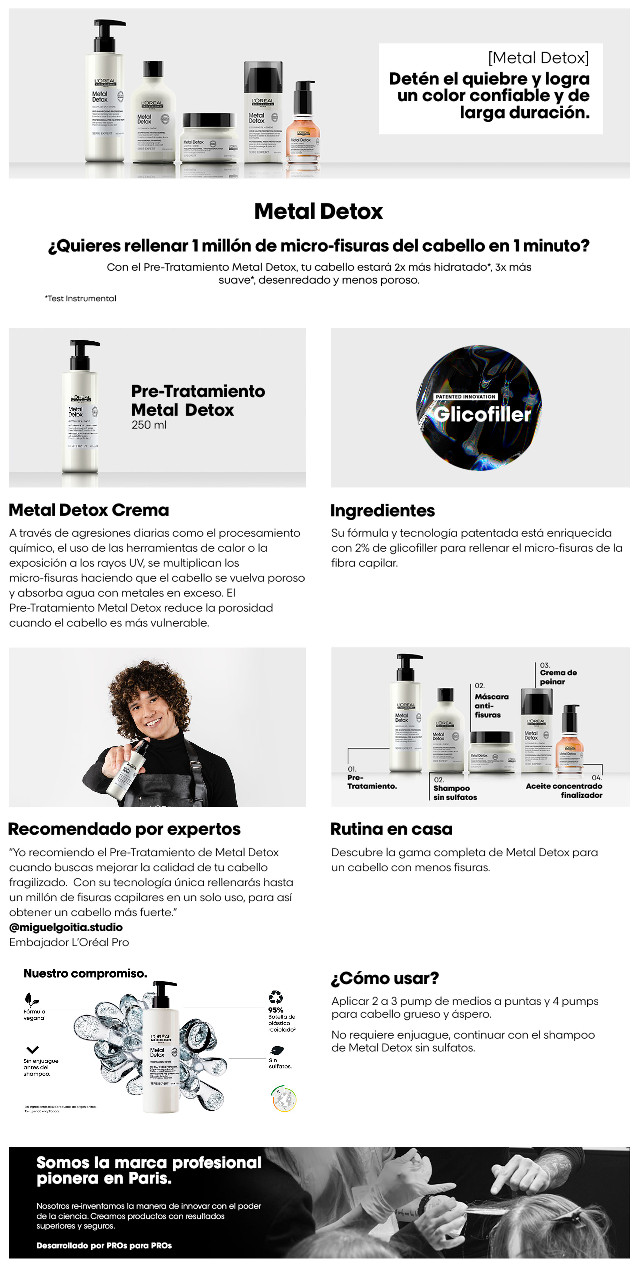 | Instrucciones de Uso | Aplicar tratamiento Pre-Shampoo Metal Detox, en capas antes del en crema antimetal: 1) Separe el cabello mojado en 2 secciones. 2) Aplicar de 2 a 4 pumps por sección dependiendo de la longitud. Aplique el producto en largos y puntas durante 1 a 2 minutos hasta que aparezca una espuma ligera. Desenredar. 3) No enjuagar. En una técnica de capas, aplique el Shampoo Metal Detox directamente sobre la parte superior, luego enjuague y siga con la rutina. |